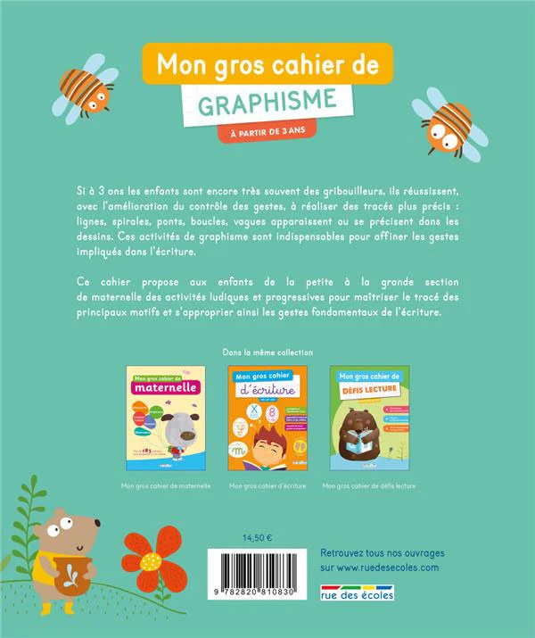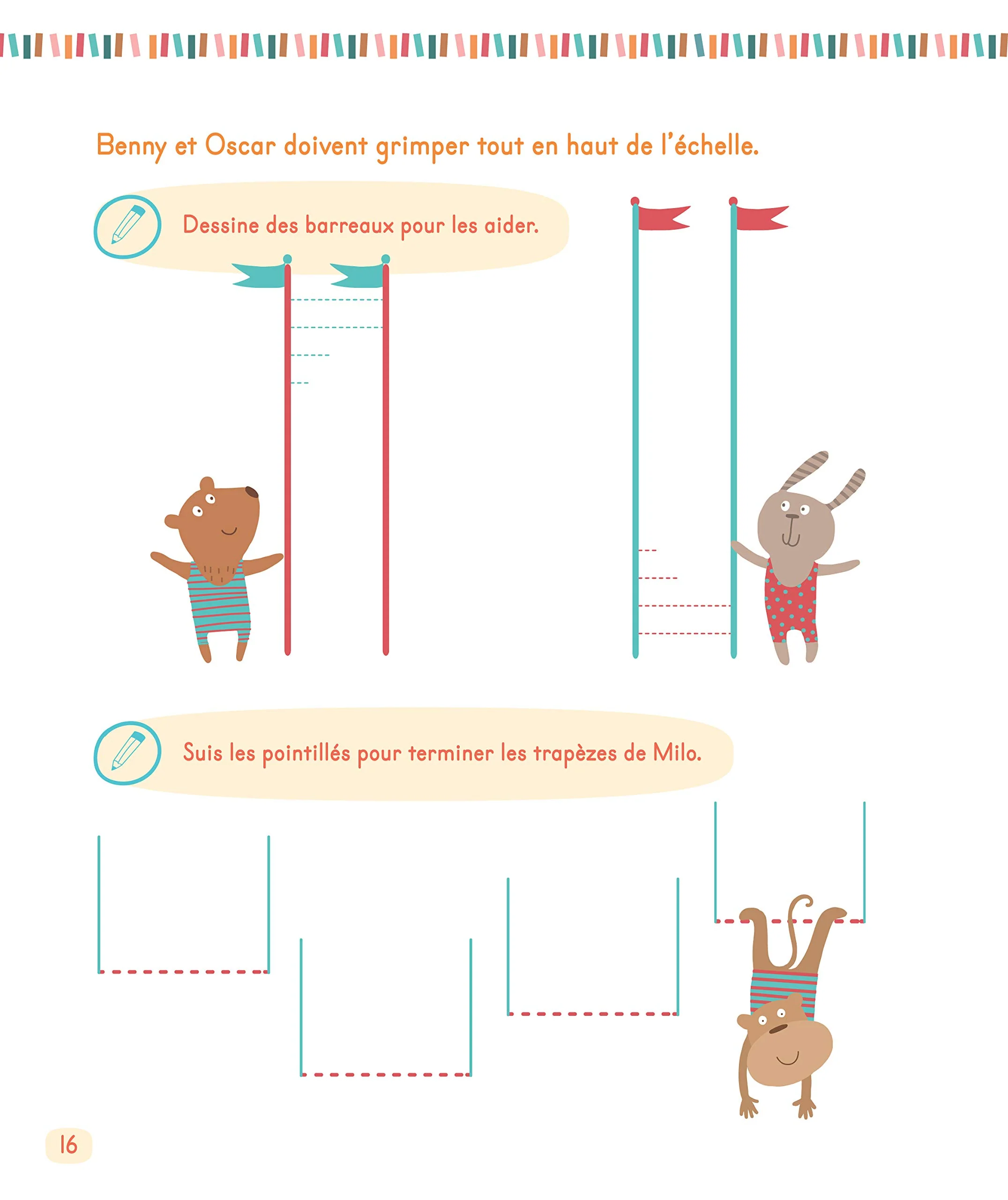 Ce cahier propose aux enfants de la petite à la grande section de maternelle des activités ludiques et progressives pour maîtriser le tracé des principaux motifs et s’approprier ainsi les gestes fondamentaux de l’écriture.