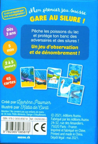 Jeu de société pour enfant dès 3 ans. Pêche les poissons du lac et protège ton banc des adversaires et des silures ! Silure, goujon, perche, truite, omble chevalier, brochet : découvre la faune qui peuple les lacs suisses ! Un jeu d’observation et de dénombrement, spécialement adapté aux 3 ans ! Les illustrations vives […]