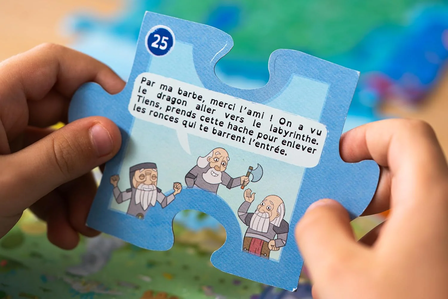 Mon Puzzle Aventure est le renouveau d’un classique : le puzzle. Une fois le puzzle réalisé, choisissez un des 3 personnages. Retournez sa tuile et l’aventure commence. Au dos de la pièce se trouve un petit texte qui vous guidera pour trouver la suivante. En chemin, de nombreux obstacles et énigmes pimenteront votre aventure et transformeront le rangement du puzzle en une multitude d’histoires épiques. De nombreuses activités et défis se trouvent tout au long de l’histoire : cherche et trouve, énigme, suivre des indices, collecte, etc…