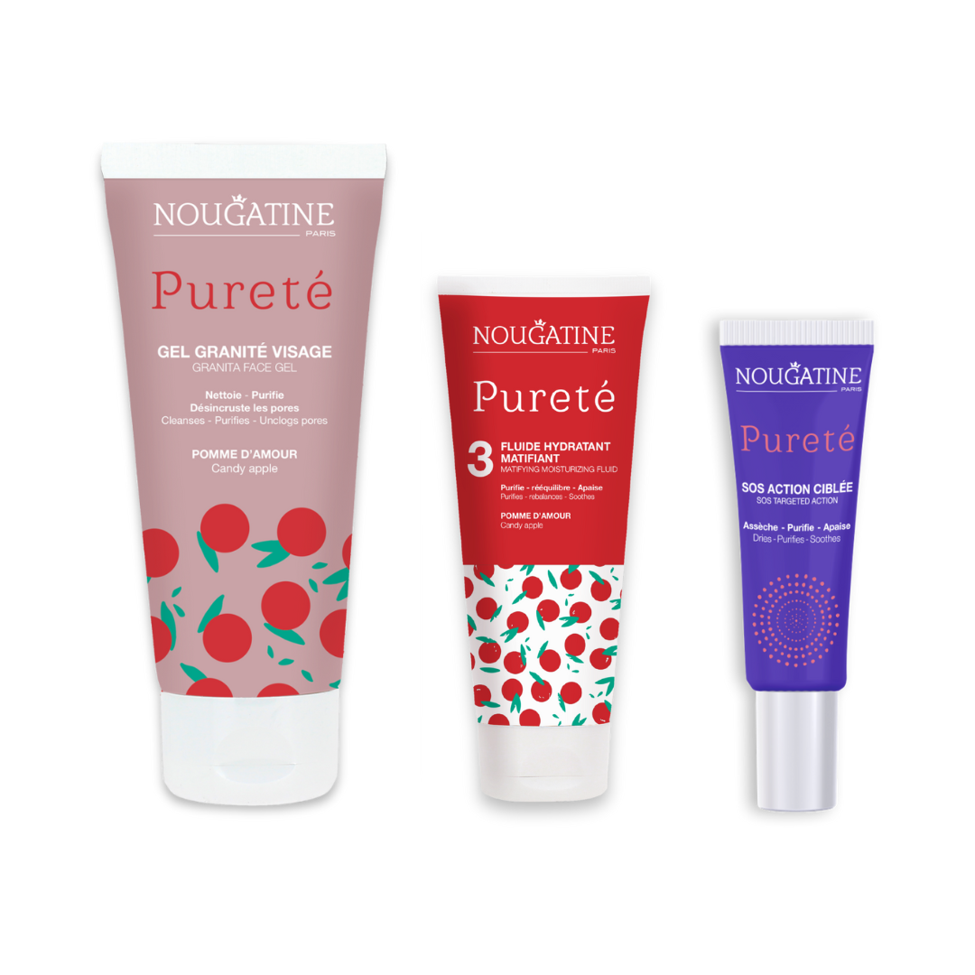 Nouveauté ! Une routine quotidienne en 3 étapes pour nettoyer, purifier, hydrater et matifier ta peau. À partir de 10 ans.