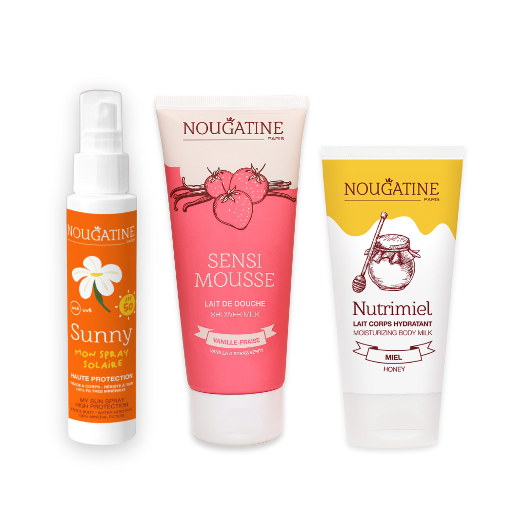Un trio essentiel pour prendre soin de votre peau au soleil : une routine complète, aux formules d’origine naturelle, pour protéger, nettoyer et nourrir en douceur. À partir de 3 ans.