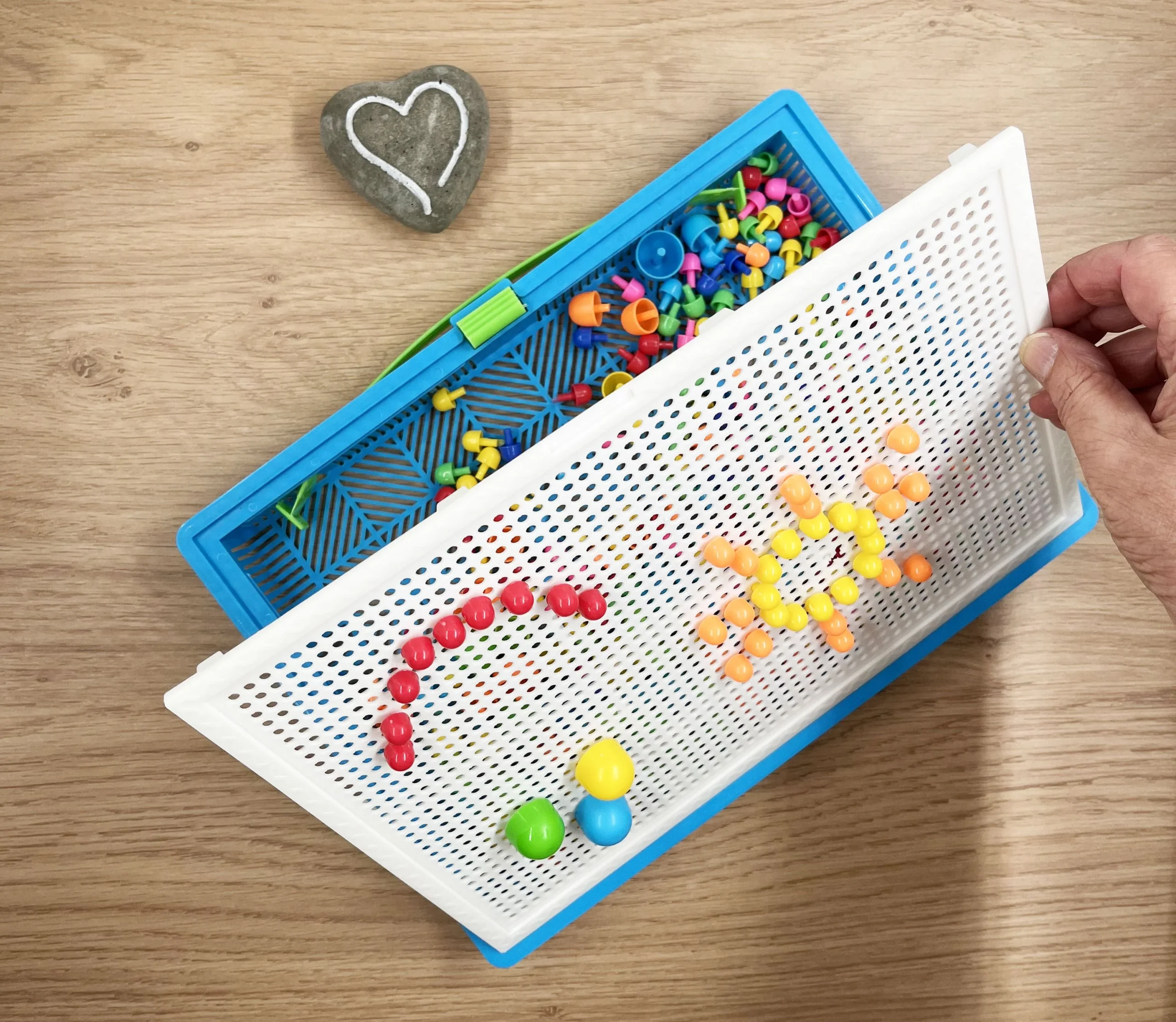 Un tableau perforé et 296 picots en plastique de toutes les couleurs et toutes les tailles pour faire de beaux tableaux très colorés.