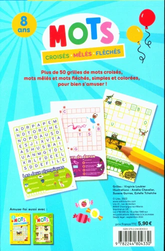 Mots croisés, mots fléchés et mots mêlés : 50 grilles de jeux de mots, pour s’amuser avec les thèmes préférés des enfants : la ferme, les couleurs, les fruits, les animaux, le foot, le poney, la maison et bien plus encore.