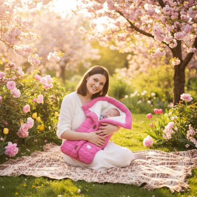 Notre nid d’ange bébé tricoté devient votre allié incontournable. En un geste, vous l’installez dans la poussette.