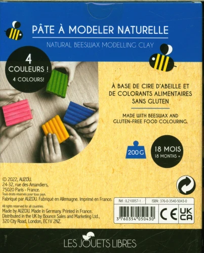 Une pâte à modeler biologique à base de véritable cire d’abeille naturelle et de colorants alimentaires (sans gluten).