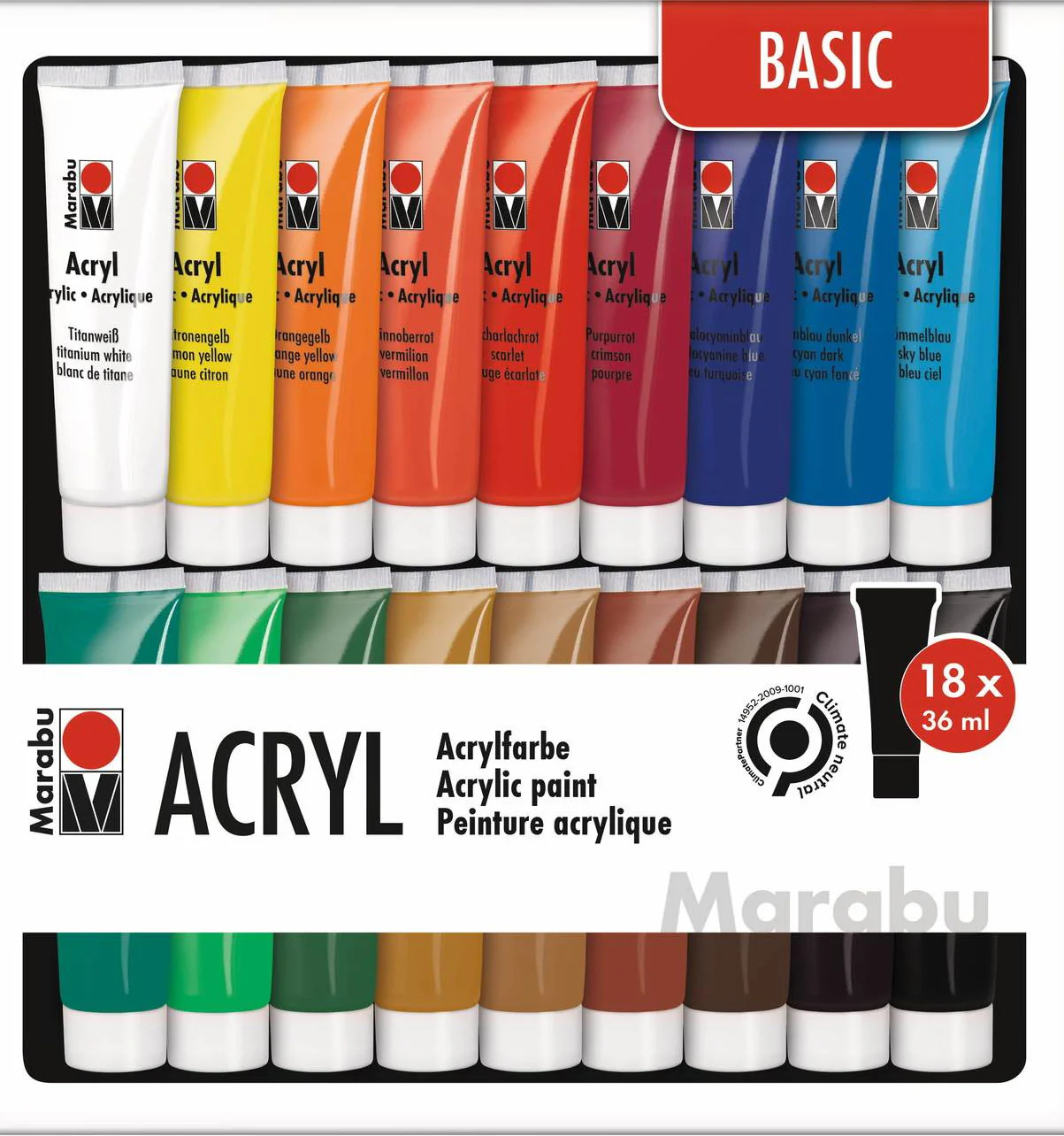 Le set de peintures acryliques Marabu contient 18 tubes de 36 ml avec les coloris suivants: blanc titane, jaune citron, ocre jaune, jaune orange, vermillon, écarlate, pourpre, vert émeraude, vert viridian, vert jus, bleu cyan foncé, bleu ciel, bleu phtalocyanine, siena, siena brûlé, umbra brûlé, brun vandyke et noir.