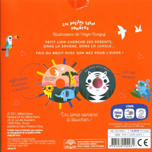 - Un livre jeu d’éveil pour développer la motricité fine: on appui sur le nez pour qi’il fasse du bruit….