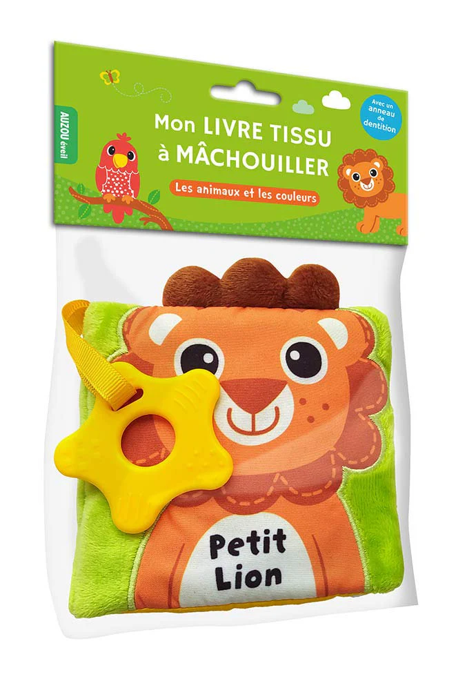 Petit lion – Les animaux et les couleurs – livre tissu avec un anneau de dentition