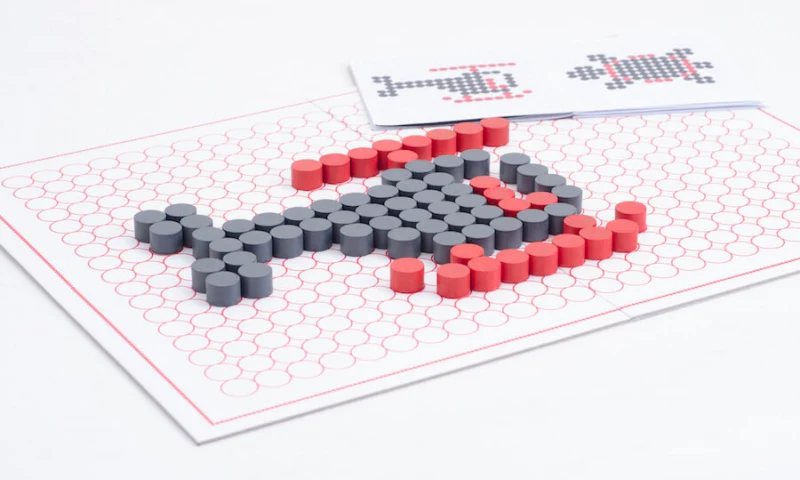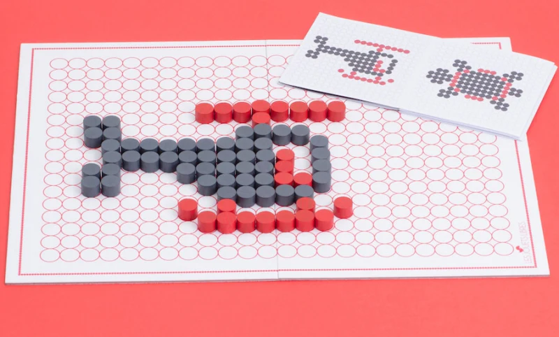 Il dispose les pions sur le damier en suivant les modèles du livret d’apprentissage, ou il invente ses propres créations !