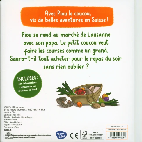 Piou se rend au marché de Lausanne avec son papa. Le petit coucou veut faire les courses comme un grand. Saura-t-il tout acheter pour le repas du soir sans rien oublier ?
