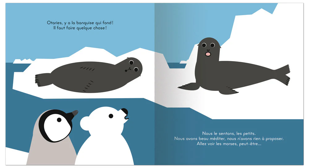 Dans cet album de Claire Garralon, ce sont les jeunes animaux qui alertent les adultes — incrédules comme papa manchot, ou impuissants comme papa ours — sur la situation actuelle.
