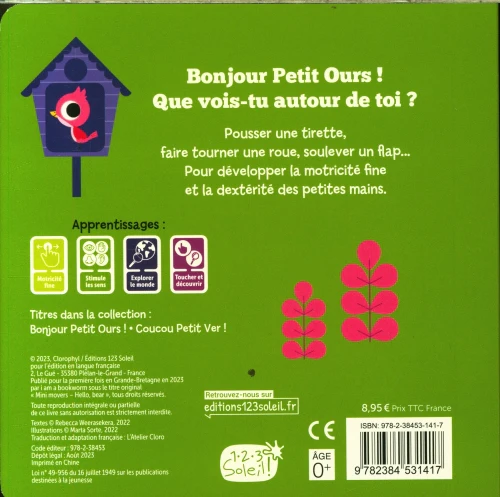Avec ses roues à tourner, ses volets à soulever et ses mécanismes à pousser, ce livre plein de surprises invite les tout-petits à suivre Petit Ours dans ses aventures du matin. Du lever au petit-déjeuner, en passant par l’habillage et les jeux, chaque geste du quotidien devient un moment de découverte et d’amusement.
