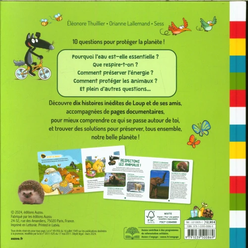 Guidés par Loup et ses amis, les enfants explorent dix grandes questions : pourquoi l’eau est-elle précieuse ? Comment purifier l’air ? Pourquoi protéger les abeilles, les arbres et les animaux sauvages ? À la fin de chaque double-page, des réponses simples, des illustrations claires et des idées accessibles pour comprendre les enjeux et agir au quotidien, sans dramatiser.