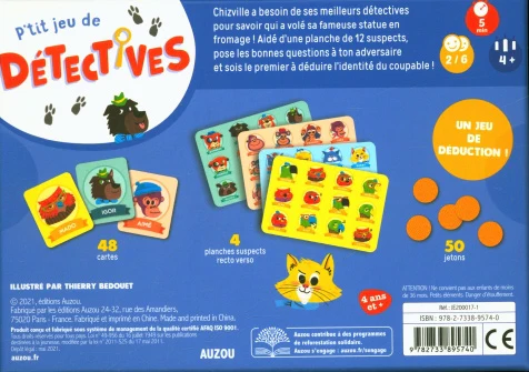 Chizville a besoin de ses meilleurs détectives pour savoir qui a volé sa fameuse statue en fromage ! Aidé d’une planche de douze suspects, pose les bonnes questions à ton adversaire et sois le premier à déduire l’identité du coupable !