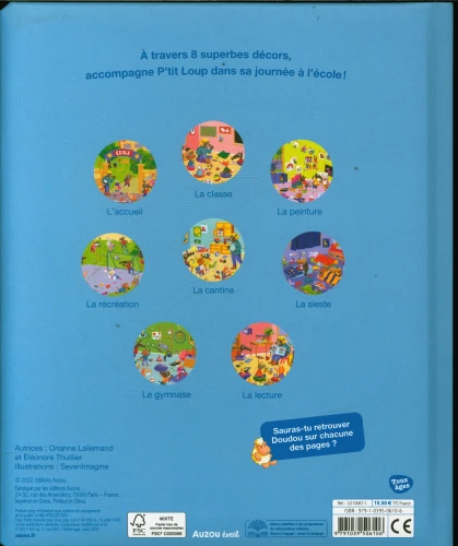 Dans ce cherche et trouve plein de vie, accompagne P’tit Loup dans sa classe, la cour de récré, la cantine et bien plus encore.