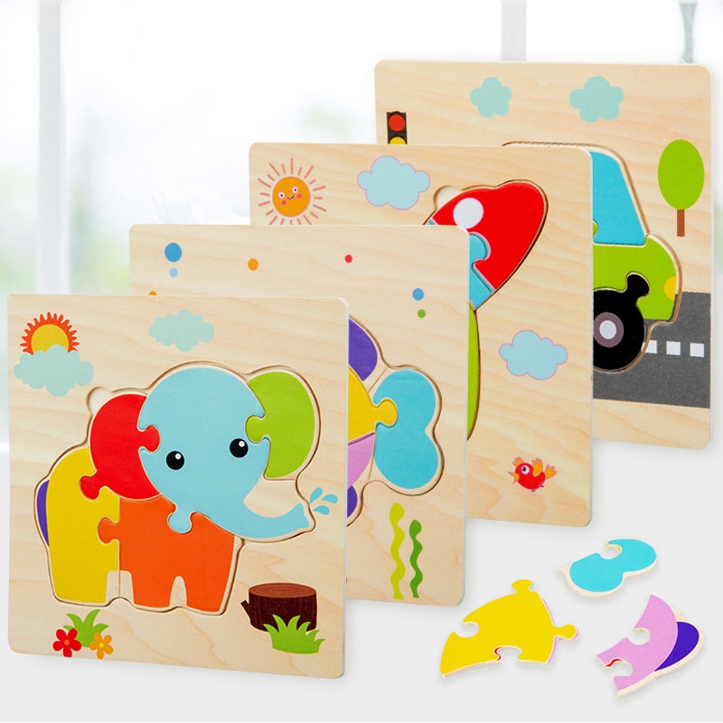 Puzzle disponible en plusieurs modèles. Chaque modèle comporte 5/6 pièces à assembler de couleurs et formes différentes afin de reconstituer le puzzle final. Jeu conseillé à partir de 2 ans, à utiliser sous la surveillance d’un adulte.