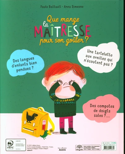 Les enfants s’interrogent sur la composition du goûter de leur enseignante et imaginent qu’elle mange des langues d’enfants bien pendus ou de la compote de doigts sales.