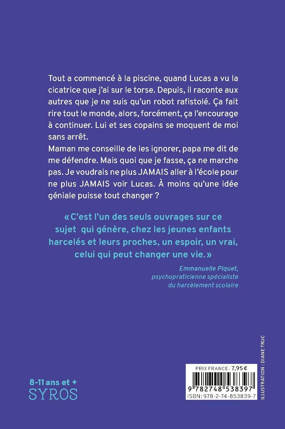 Tout a commencé à la piscine, quand Lucas a vu la cicatrice que j’ai sur le torse. Depuis, il raconte aux autres que je ne suis qu’un robot rafistolé. Ça fait rire tout le monde, alors, forcément, ça l’encourage à continuer. Lui et ses copains se moquent de moi sans arrêt. Maman me conseille de les ignorer, papa me dit de me défendre. Mais quoi que je fasse, ça ne marche pas. Je voudrais ne plus JAMAIS aller à l’école pour ne plus JAMAIS voir Lucas.