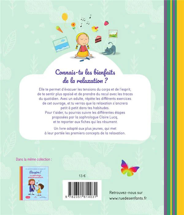 Elle te permet d’évacuer les tensions du corps et de l’esprit, de te sentir plus apaisé et de prendre du recul avec les tracas du quotidien. Avec un adulte, répète les différents exercices de cet ouvrage, et tu verras que la relaxation s’ancrera petit à petit dans tes habitudes.