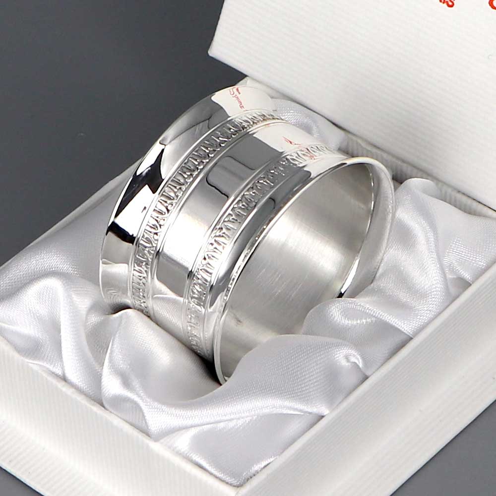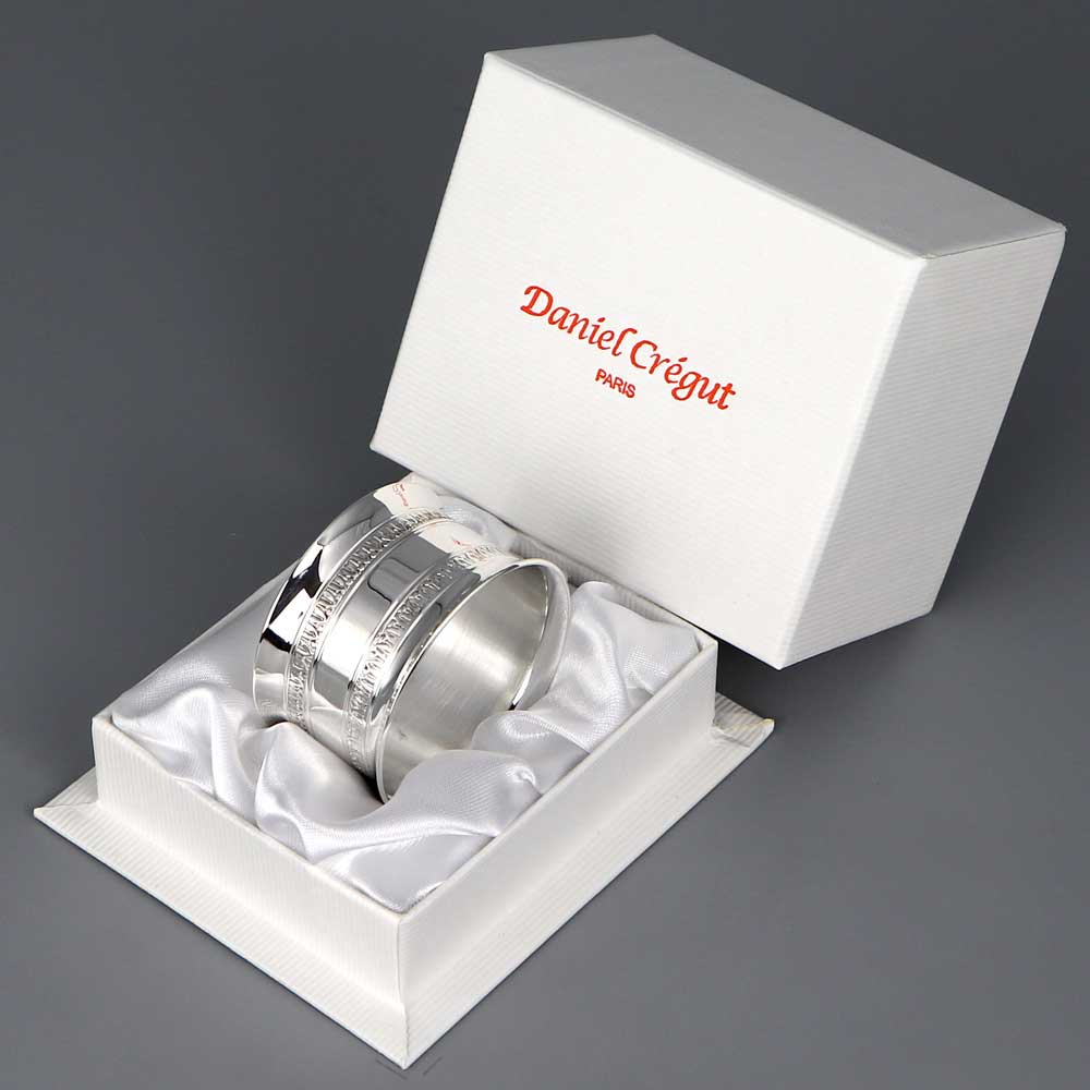Rond de serviette argent (métal argenté) Empire 2 Rangs. H : 3 cm | Ø : 4.5 cm. Un rond de serviette Daniel Crégut. Offrez un rond de serviette personnalisé avec la gravure d’un prénom et une date. Deux filets Empire décorent ce rond de serviette.
