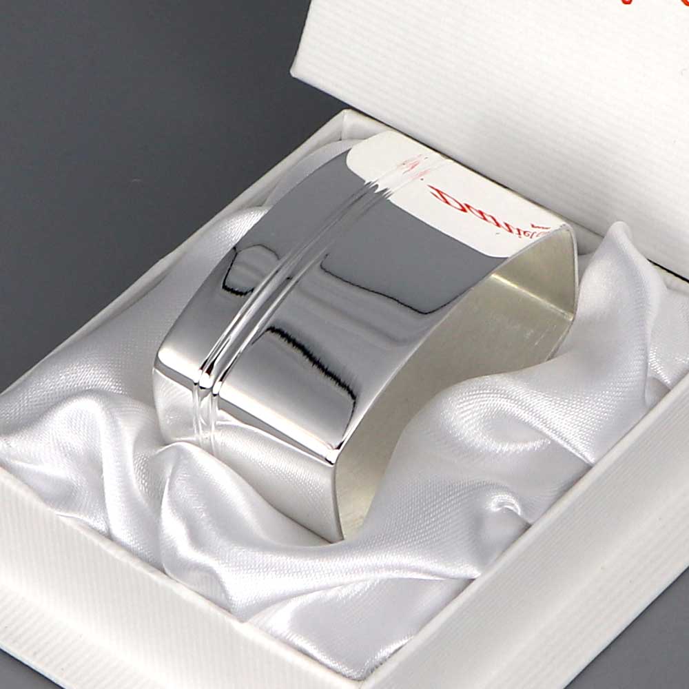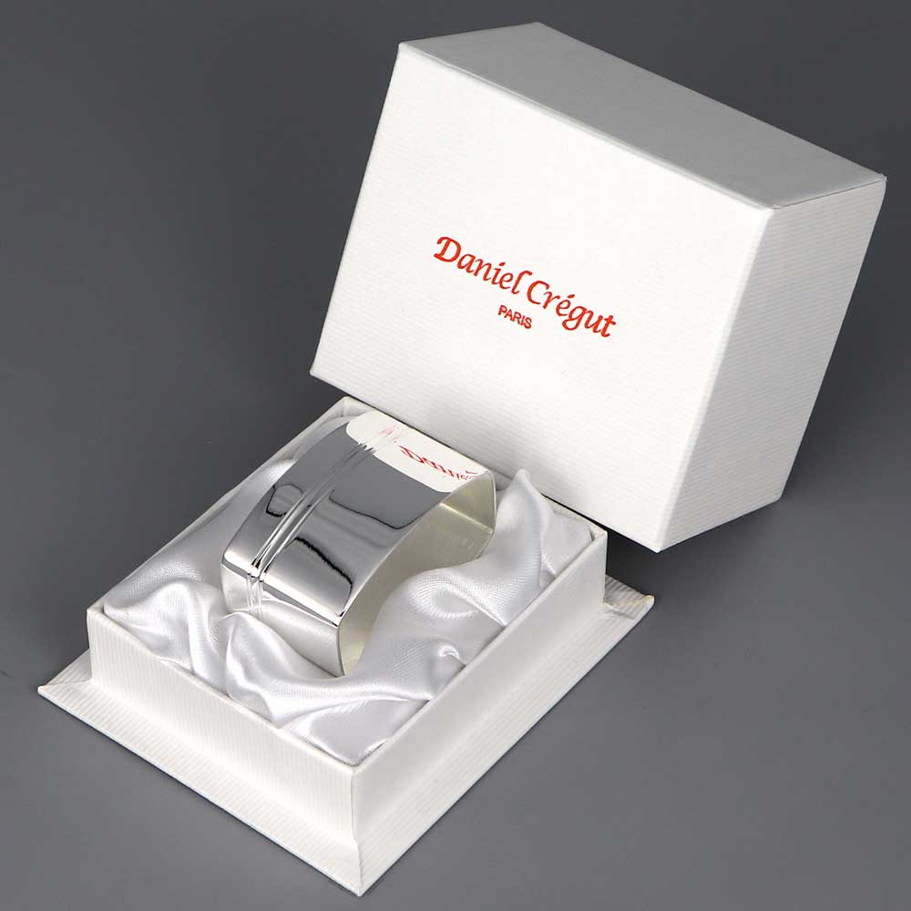 Rond de serviette argent (métal argenté) Lien une gorge. H : 3 cm | L : 5.5 cm. Un rond de serviette Daniel Crégut. Offrez un rond de serviette personnalisé avec la gravure d’un prénom et une date. Rond de serviette rectangulaire (lien) décoré d’un liseret.