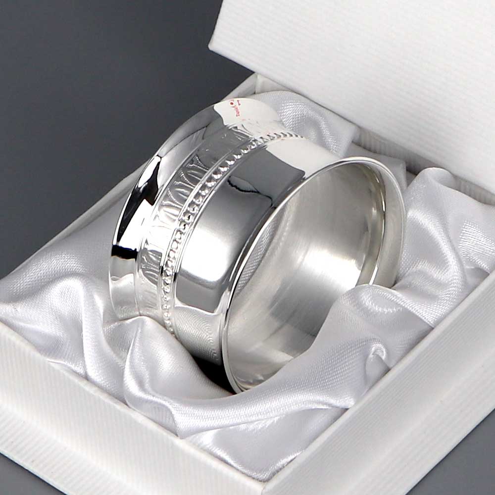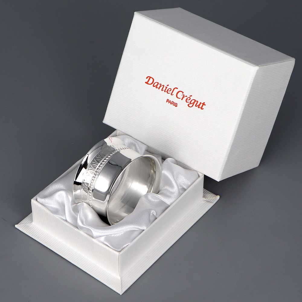 Rond de serviette argent (métal argenté) Marie-Louise. H : 3 cm | Ø : 4.5 cm. Un rond de serviette Daniel Crégut. Offrez un rond de serviette personnalisé avec la gravure d’un prénom et une date. Rond de serviette aux bords évasés, décoré de perles et d’un filet empire.