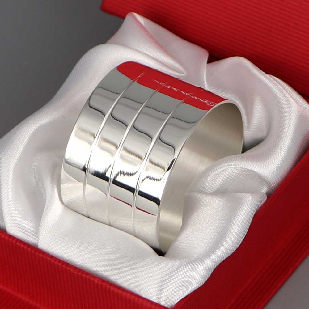 Rond de serviette argent massif Biarritz. H : 3 cm | Ø : 4.5 cm. Un rond de serviette Aubry-Cadoret. Offrez un rond de serviette personnalisé avec la gravure d’un prénom et une date. Moderne, d’inspiration Art-déco, ce rond de serviette est décoré de trois filets.