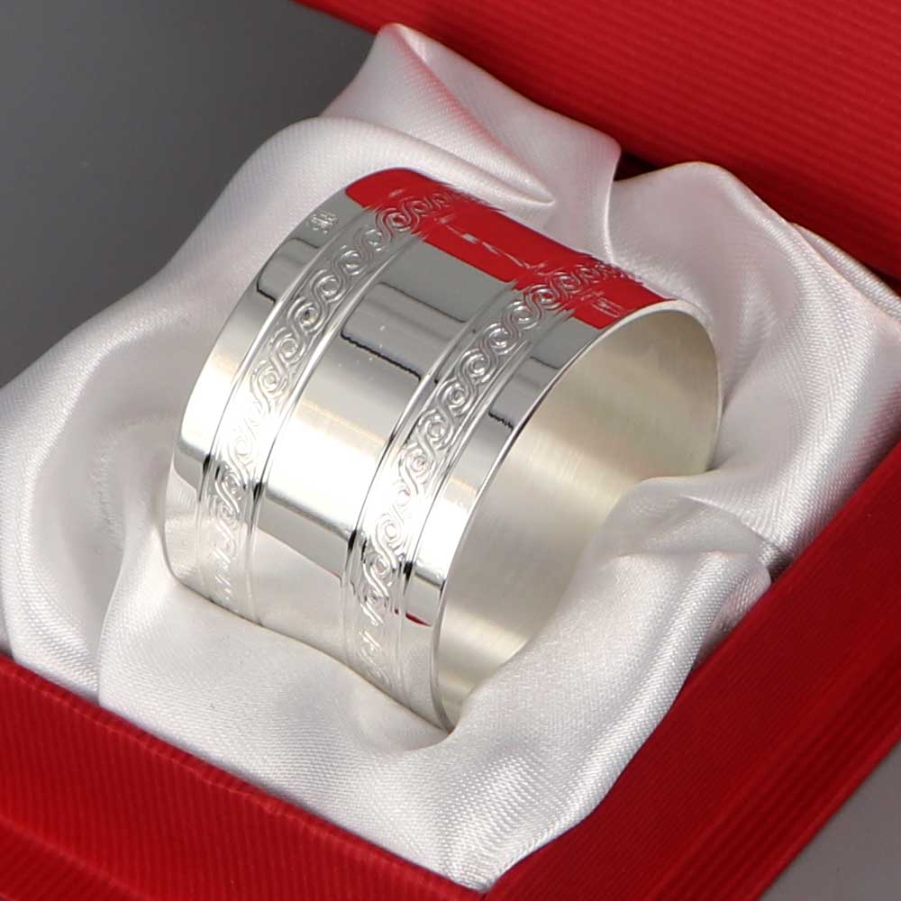 Rond de serviette droit, décoré de deux filets de motifs entrelacés.