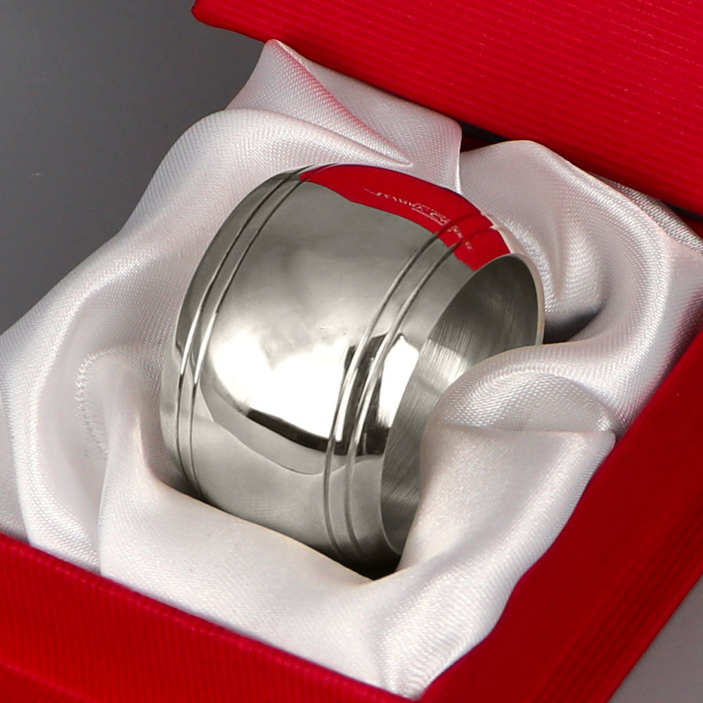 Rond de serviette argent (métal argenté) Tonneau Filet. H : 3 cm | Ø : 4.5 cm. Un rond de serviette Aubry-Cadoret. Offrez un rond de serviette personnalisé avec la gravure d’un prénom et une date. Rond de serviette de forme arrondie avec filet.