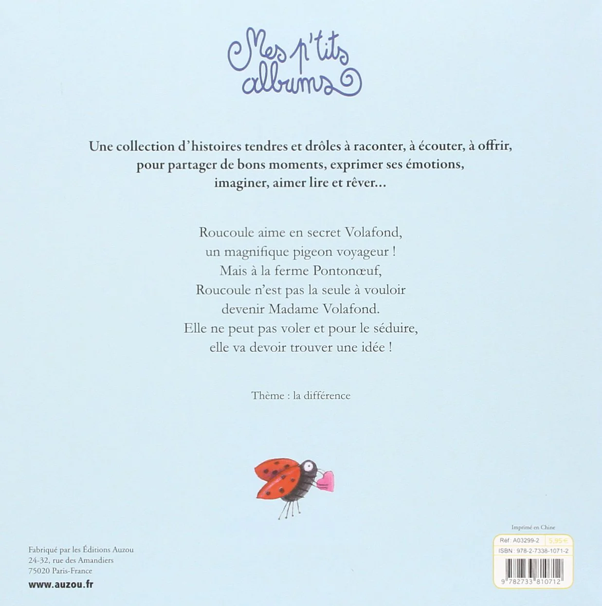 Roucoule aime en secret Volafond, un magnifique pigeon voyageur ! Mais à la ferme Pontonceuf, Roucoule n’est pas la seule à vouloir devenir Madame Volafond.Elle ne peut pas voler et pour le séduire, elle va devoir trouver une idée ! Pages : 32 Age : dès 3 ans