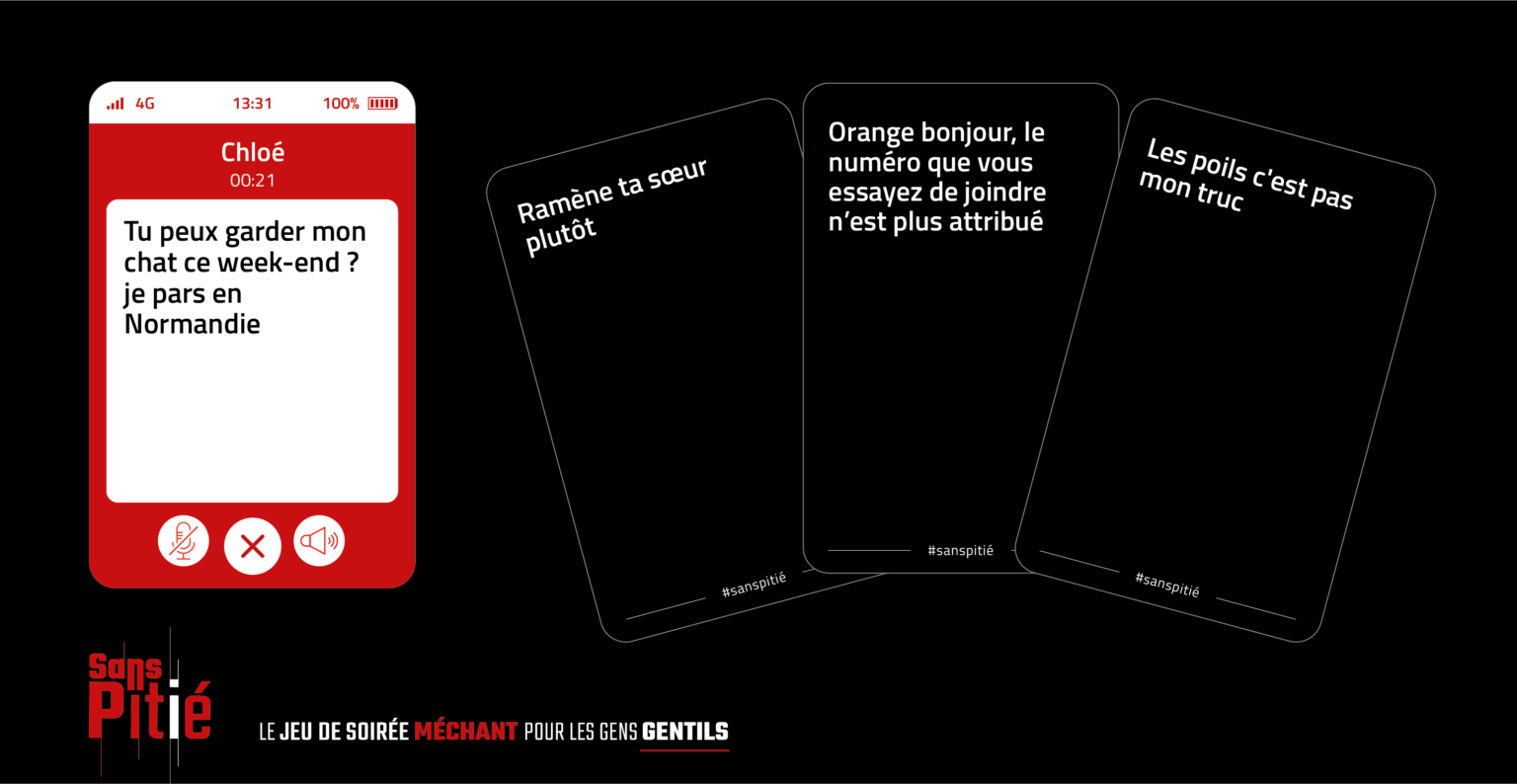 Ā«Sans PitiĆ©, le jeu de soirĆ©e mĆ©chant pour les gentilsĀ», est un jeu Ć lāhumour corrosif destinĆ© aux adultes. Le concept repose sur nos rĆ©ponses aux interactions de la vie quotidienne (emails, appels, conversations, rĆ©seaux sociaux…).