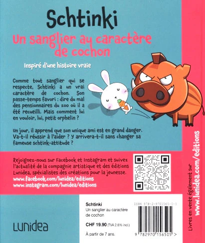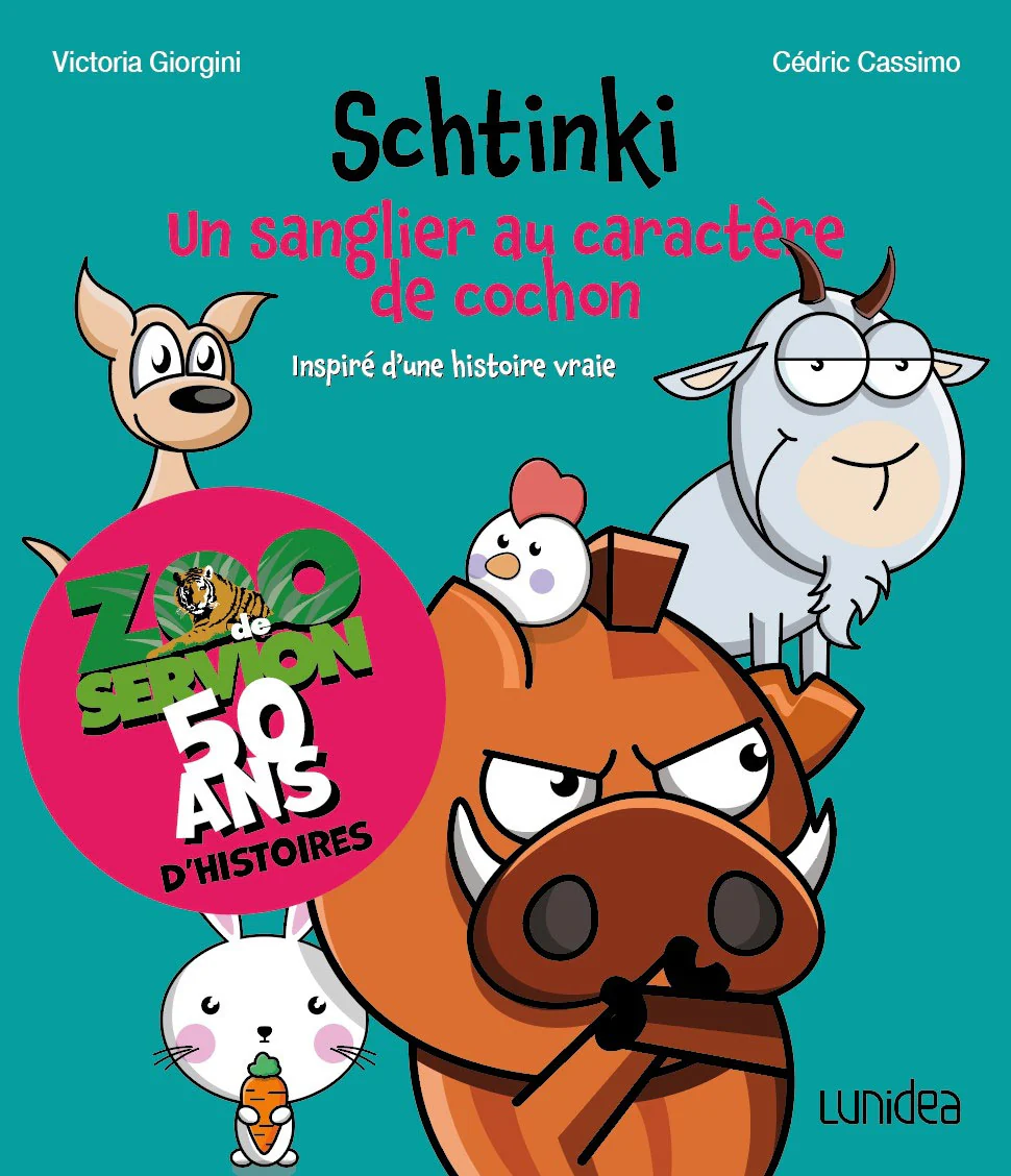 « Schtinki, un sanglier au caractère de cochon » est inspiré d’une histoire vraie contée à Victoria Giorgini par le directeur du Zoo de Servion, Roland Bulliard. Le fameux sanglier est d’ailleurs toujours pensionnaire du parc !