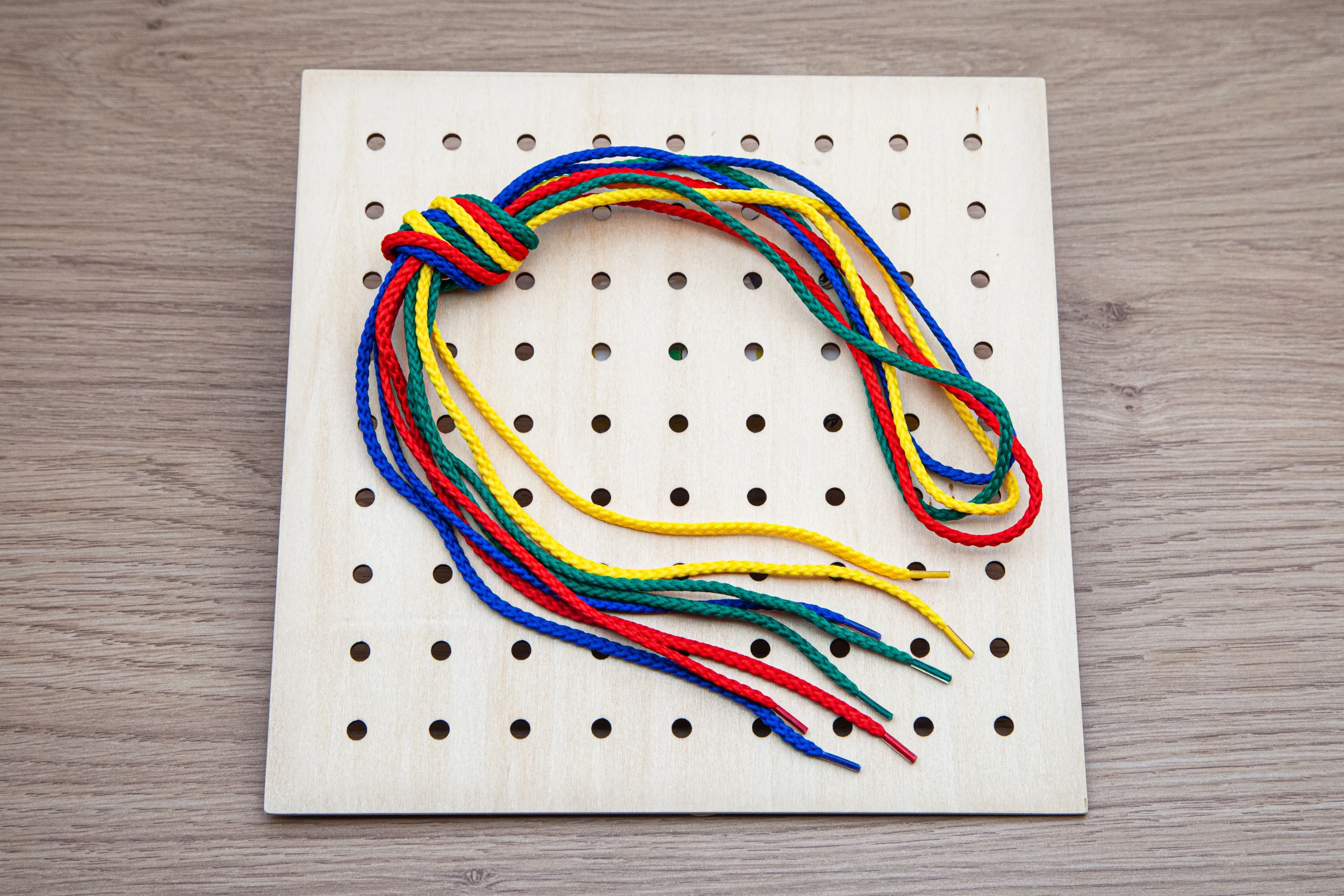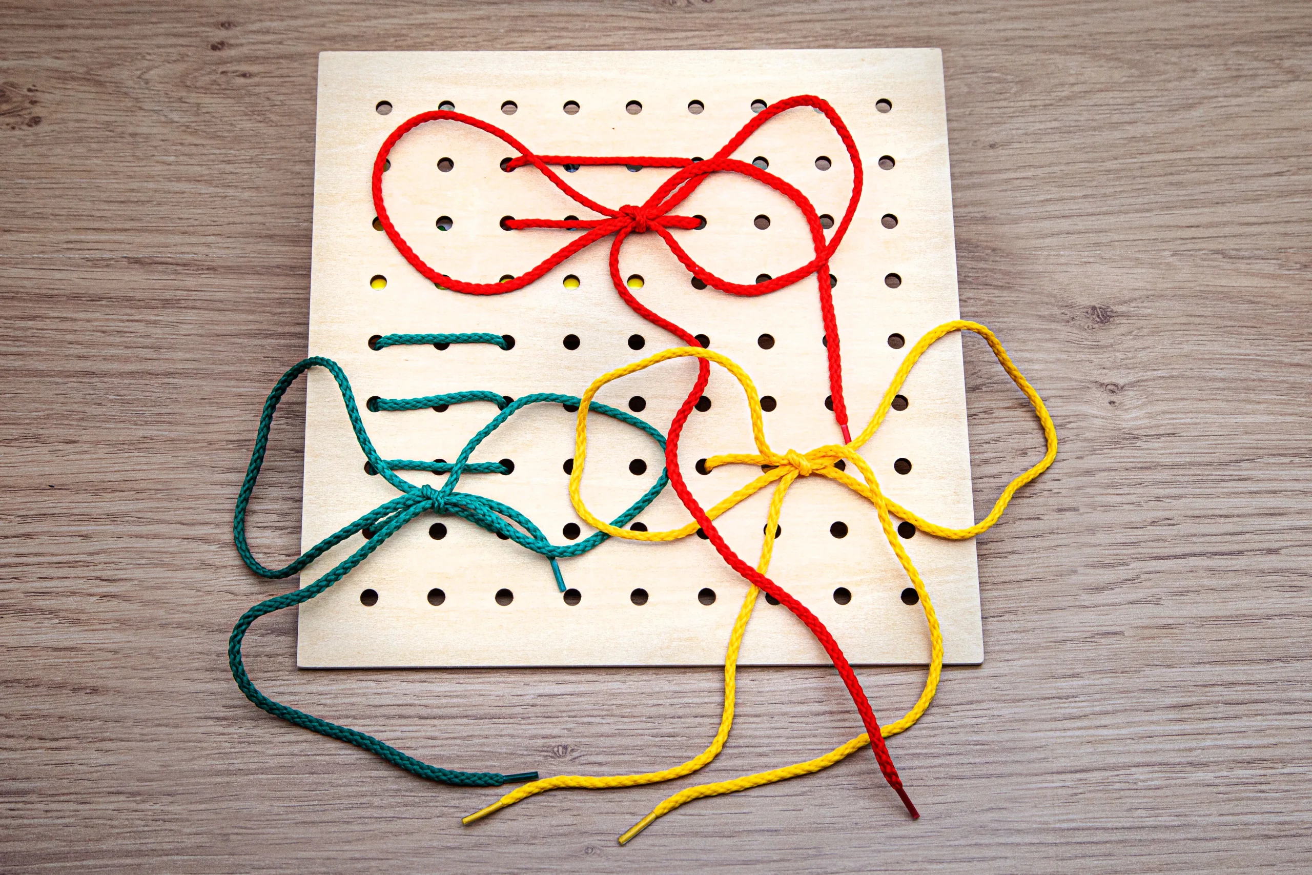 Ce carré d’enfilage est le support idéal pour exercer le jeune enfant à faire des boucles et des nœuds, qui développent la motricité fine de l’enfant et sa concentration.