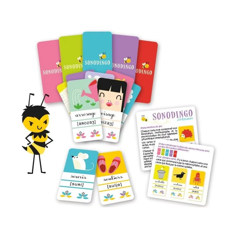 Adapté dès 5 ans et doté de 102 cartes, le jeu offre cinq niveaux différents et une combinaison de jeux classiques – comme le Mistigri, le Rami et la Bataille – qui rendent la phonologie plus amusante. L’orthographe des mots apporte davantage d’enseignements, en mettant en lumière les différentes façons d’écrire une même syllabe.