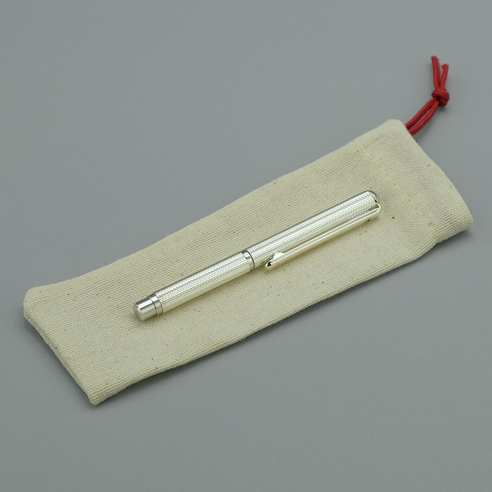 Ce stylo à bille en argent massif guilloché, qui évite les rayures dans un sac ou une poche, est un cadeau d’une grande élégance. Avec ses 8.5 cm, il accompagne parfaitement un petit carnet, agenda ou une pochette. Poids environ 17 gr. Encre bleue.
