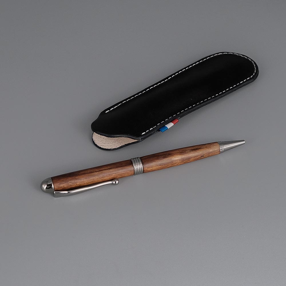 [vc_row][vc_column][vc_column_text css= » » css_params= » »]Magnifique stylo bille en bois et métal à encre noir avec son étui en cuir de fabrication Française.