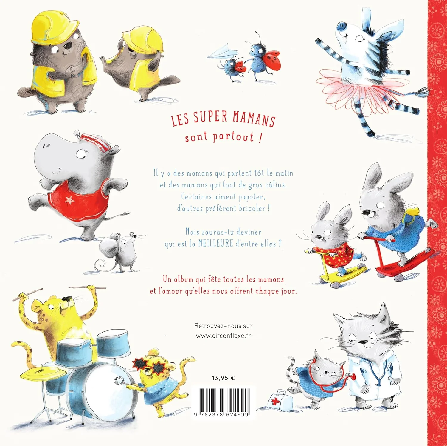 Les super mamans sont partout ! Il y a des mamans qui partent tôt le matin. D’autres qui font de gros câlins. Certaines aiment papoter, d’autres préfèrent bricoler ! Mais sauras-tu deviner qui est la meilleure d’entre elles ? Un album qui fête toutes les mamans ainsi que l’amour qu’elles nous offrent chaque jour.
