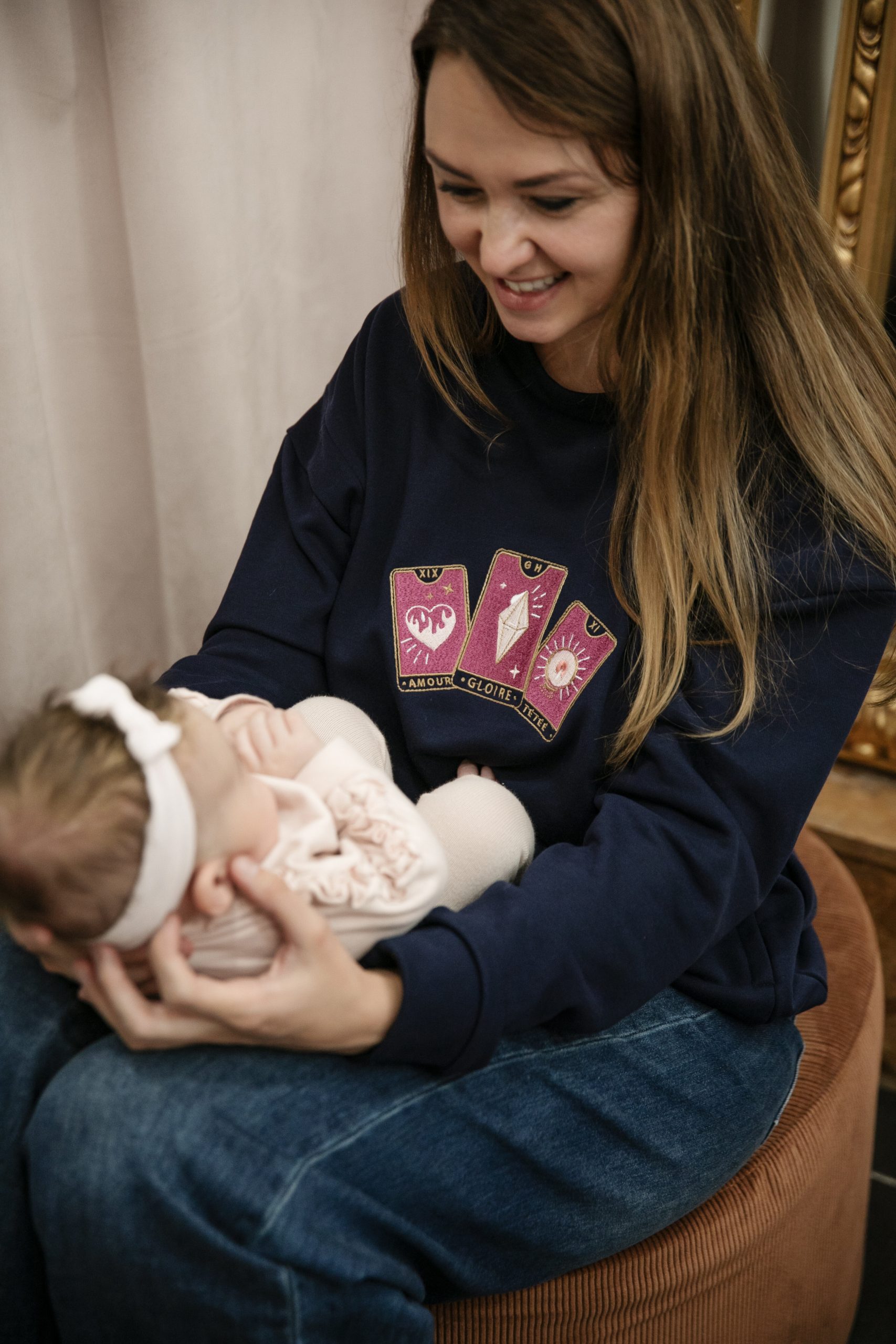 Prépare-toi à entrer dans un monde où l’allaitement rime avec mystère et magie ! Notre sweat oversize à emmanchures basses « Amour, Gloire et Tétée » est bien plus qu’un simple vêtement, c’est une déclaration audacieuse pour toutes les mamans qui souhaitent célébrer leur parcours avec style. Avec sa broderie inspirée des cartes divinatoires, ce sweat te rappelle que chaque tétée est un tirage de cartes, révélant un avenir rempli de bonheur et de découvertes.