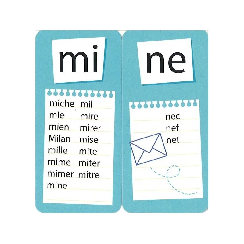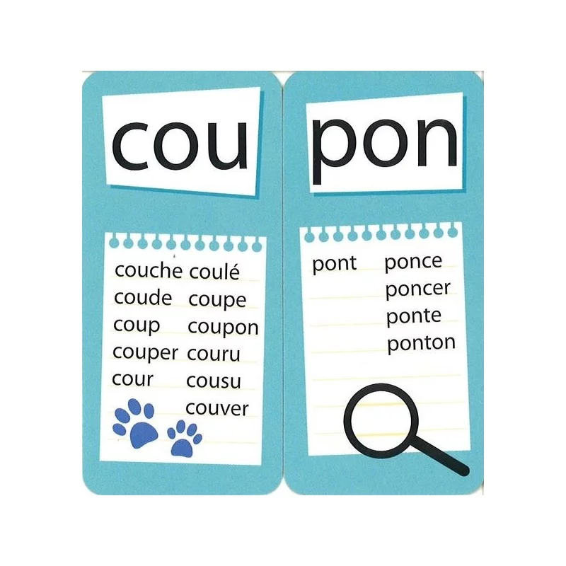 - 96 petites cartes (3,8 x 8 cm) de 2 niveaux de difficulté pour composer 700 mots (plusieurs mots possibles sont écrits sur chaque carte),