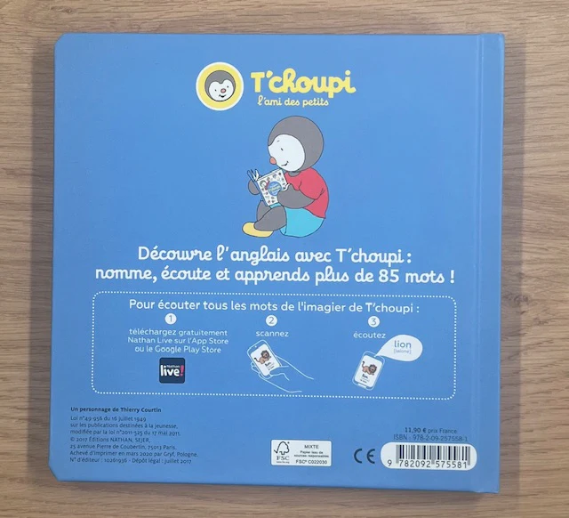 Livre pour enfant dès 2 ans Avec T’choupi, découvre les tout premiers mots en français et en anglais. 200 mots du quotidien: les animaux, les objets de la maison, les vêtements, les aliments, les couleurs… Auteur: Thierry CourtinEdition: Nathan LittératurePages: 6Dimensions: 20,8 cm x 20,8 cm x 1,7 cm