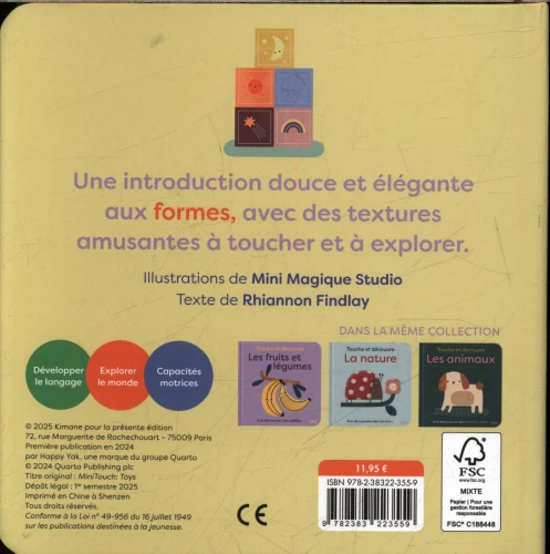 Pensé pour initier les tout-petits (dès 2 ans) aux formes fondamentales, ce format compact (10 pages carrées, environ 16 × 16 cm) favorise la motricité fine autant que l’apprentissage visuel et tactile. La curiosité est éveillée par le contraste entre l’image familière du jouet et la sensation sous les doigts : un vrai jeu d’exploration sensorielle.