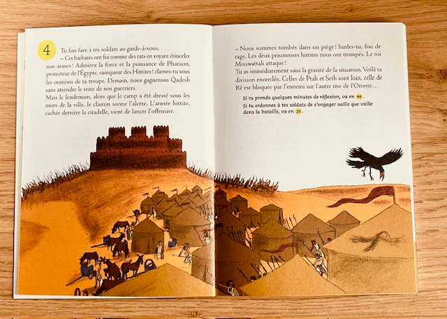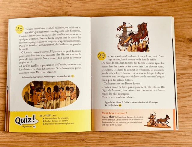 Nous avons beaucoup aimé le coté aventure historique de ce livre. Et les jeux et défis qui émaillent l’histoire de Ramsès. L’enfant qui le lira, en fonction des choix qu’il fera, ne lira jamais le même livre et c’est ce qui est vraiment sympa.