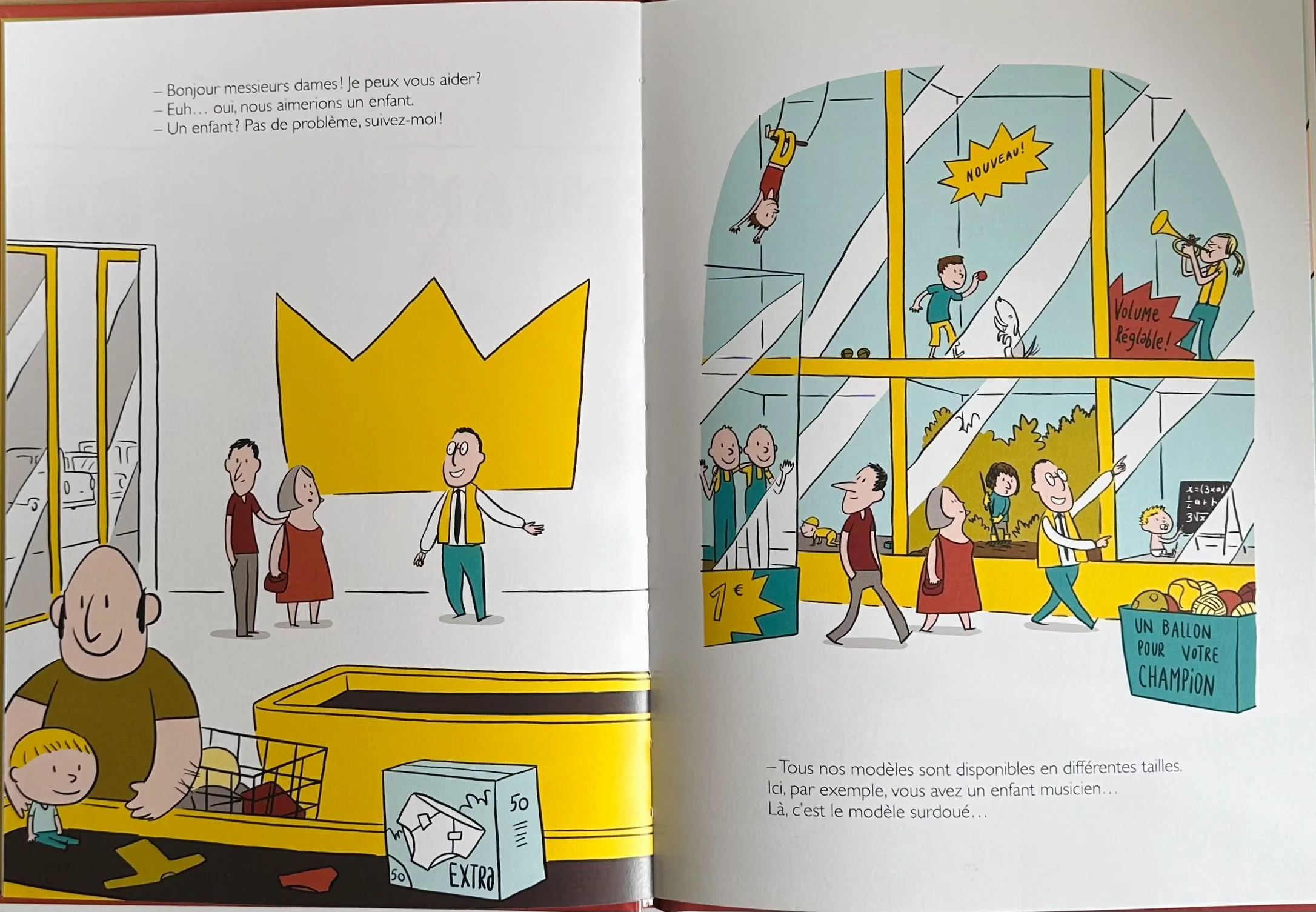 Album pour enfant dès 6 ans. Au supermarché L’Enfant Roi, on trouve un très vaste choix. Un choix de quoi ? De vêtements, de friandises, de jouets pour enfants ? Pas du tout ! On y trouve un choix d’enfants pour parents exigeants. Tailles, caractères, dons variés, on trouve de tout. Même des enfants parfaits. […]