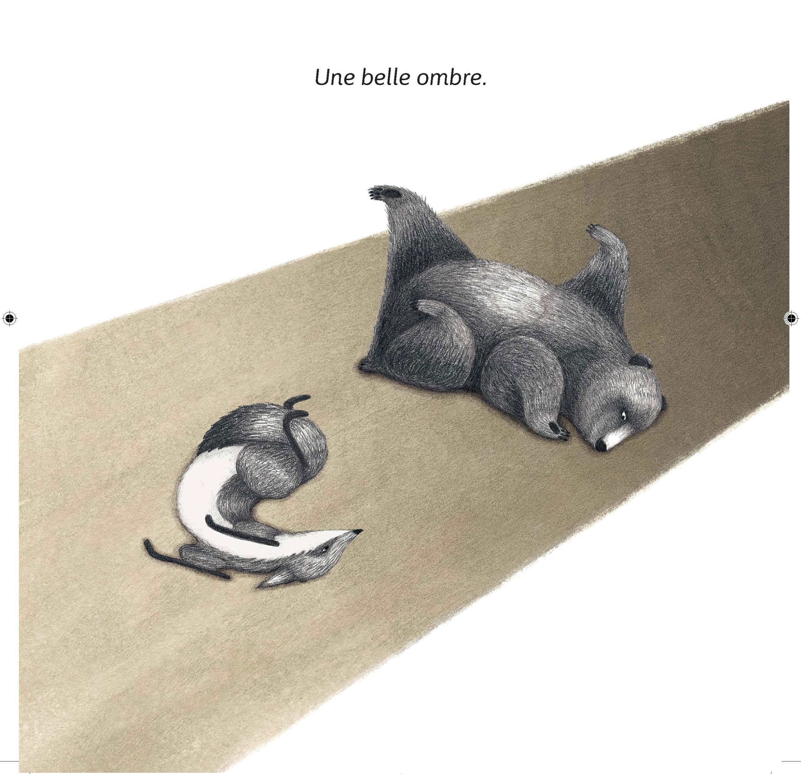 Oh! de l’ombre! Une grande ombre! Un ours et un renard s’y abritent. Puis une girafe, un lion, un raton… suivis d’autres animaux. Oh non! L’ombre rétrécit!