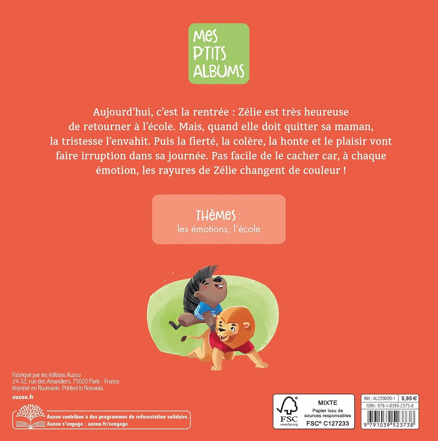 Mais quand il faut quitter sa maman, la tristesse l’envahit. Puis la fierté, la colère, la honte ou le plaisir vont faire irruption dans sa journée. Et pas facile de le cacher car à chaque émotion les rayures de Zélie changent de couleur.