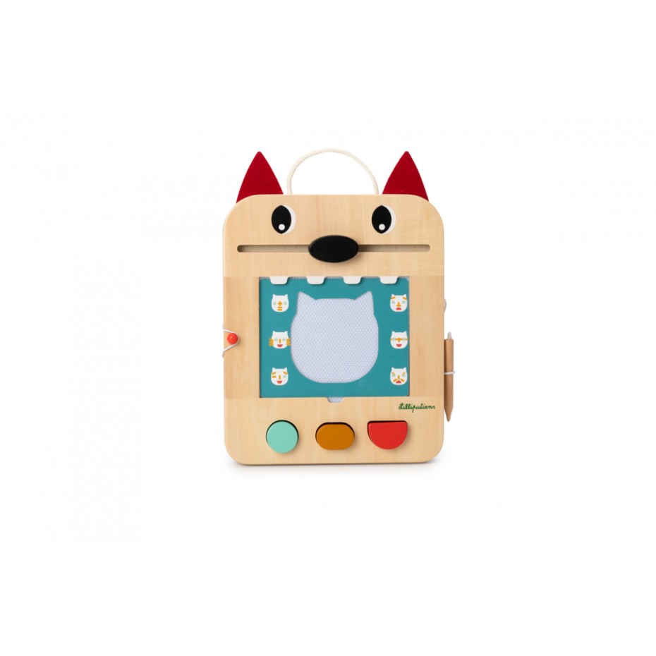 Le tableau magique de Louis le loup offre un plaisir infini de dessin et de jeu. Différentes couleurs, 3 tampons avec des formes géométriques, 6 cartes avec 12 jeux et un crayon en bois stimulent les petites mains et les esprits. Une erreur ou une envie de faire un nouveau dessin ? Alors, le museau de Louis efface le tableau. Les cartes de jeu sont rangées à l’arrière dans la fente prévue à cet effet et le crayon en bois est attaché à une corde pour ne pas le perdre.