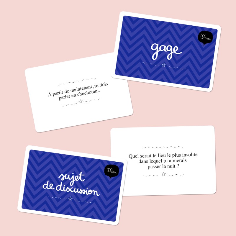 Pas de règle de jeu, avec les cartes « sujet de discussions », on se confie , on se pose des questions farfelues, on désamorce les petits tracas de la journée ! Si on n’a pas envie de parler, on pioche un « gage » (drôles mais toujours calmes !) 1 minute de massage de crâne, 5 bisous papillons…