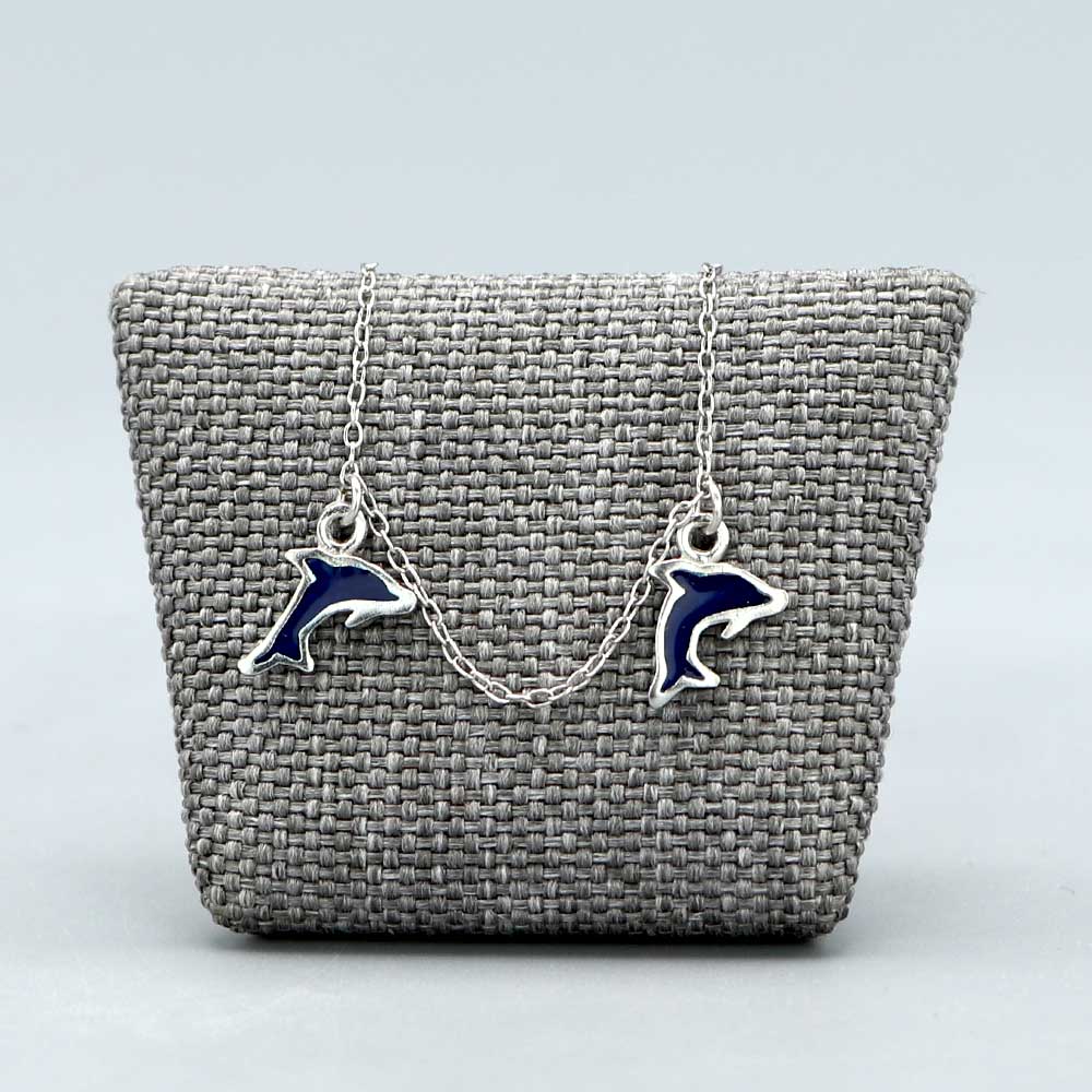 Bracelet pour enfant en argent massif et résine orné de dauphins bleu marine cerclés d’argent.