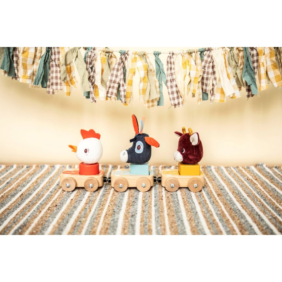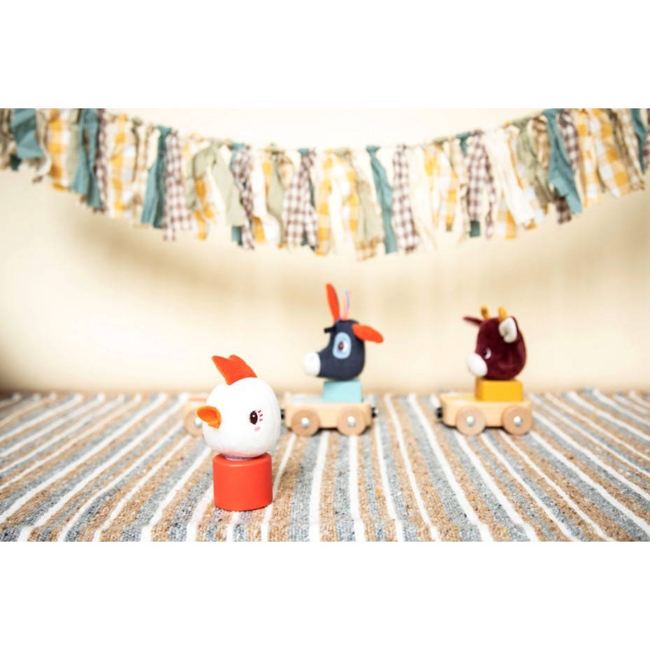 Vroum, vroum, … Paulette, Ignace et Rosalie montent chacun dans leur petite auto. Trouvez la voiture de chaque personnage en associant les formes et les couleurs et reliez les 3 autos les unes aux autres avec les aimants pour créer un beau petit train.