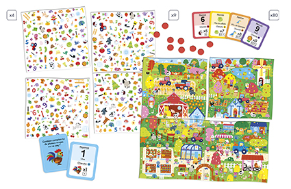 Voilà une manière amusante et intelligente d’apprendre les chiffres ! Dès 4 ans, les enfants vont adorer explorer les 4 plateaux de jeux réversibles de ce jeu éducatif pour partir à la recherche des chiffres cachés ! On apprend les chiffres jusqu’à 9 et on découvre le plaisir de compter grâce à une grande scène sur le thème de la ferme. Les animaux sont malins et cachent les chiffres que les petits devront retrouver après avoir répondu à la devinette d’une des 80 cartes questions. Quel est ce chiffre et combien de fois est-il représenté sur le plateau ? Il faudra être concentré pour reconnaître les bons éléments parmi ces belles illustrations de toutes les couleurs ! La règle du jeu est uniquement en français. Une partie dure environ 20 minutes et se joue de 1 à 4 joueurs.